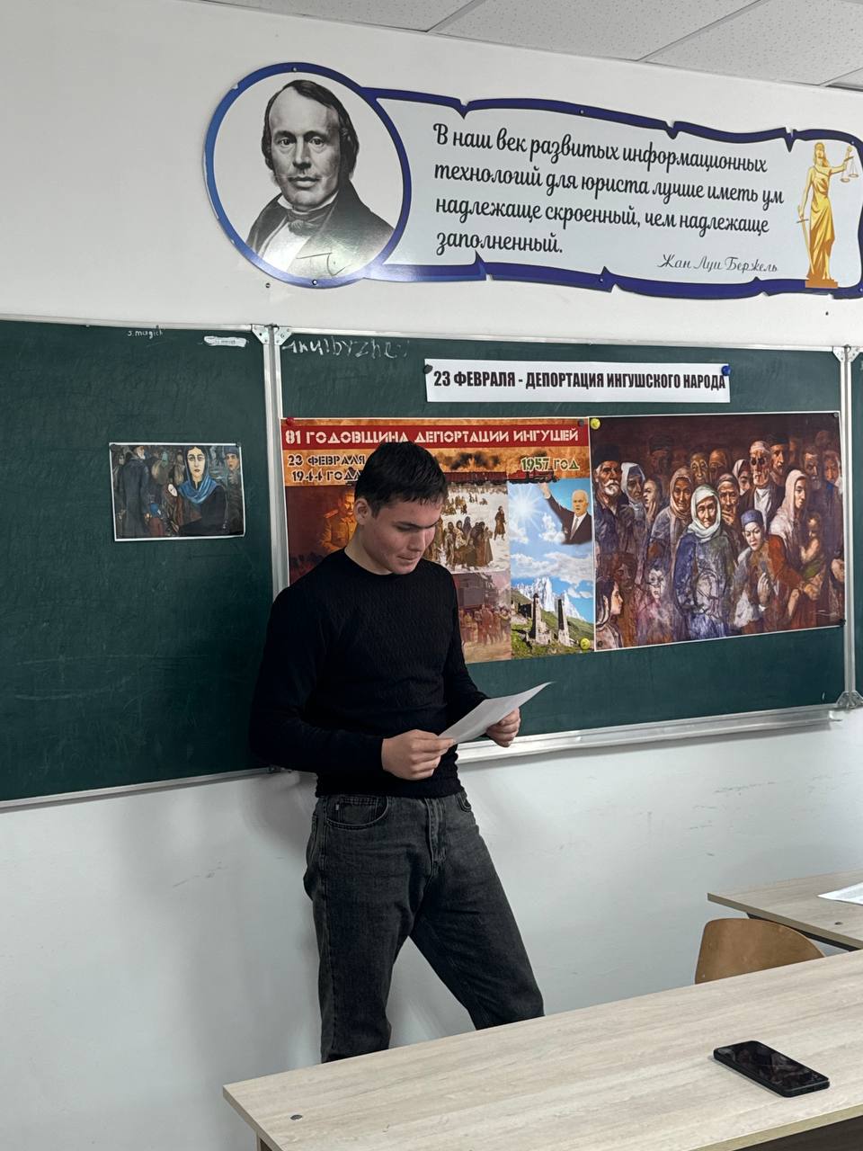 Началось роковое утро 23 февраля 1944 года для десятков тысяч ингушских семей, не ведавших о коварных планах Сталина и его окружения. Могли ли они знать, что когда-нибудь, их — мирных людей, стоявших на защите Родины объявят врагами народа. Учащиеся подготовили доклады, стихи описывающие трагические дни, которые пережили ингушский народ.