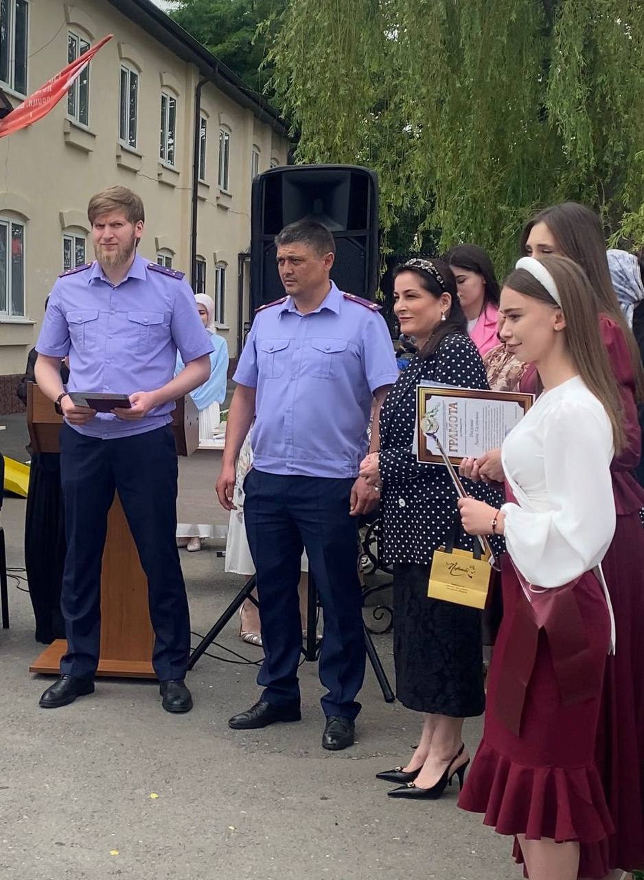 Поздравить наших выпускников пришли руководитель исполнительного комитета Ингушского Регионального отделения Всероссийской политической партии «Единая Россия» — к.ю.н. Картоев И.М., Председатель Общественной палаты РИ — Амерханова Л.С., помощник руководителя следственного управления Следственного комитета России по РИ – Горчханов У.А., Руководитель ИРО ОО «Офицеры России» — Галаев Р.М-Г., Председатель комитета по защите прав военнослужащих Республики Ингушетия — Могушкова Р.А..