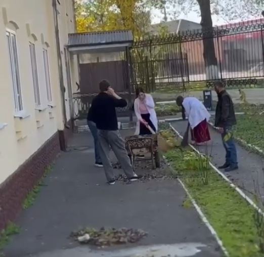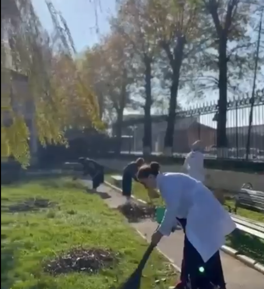 Студенты вышли на улицу с хорошим настроением и дружно взялись за дело. За пару часов студенты собрали опавшие листья, подмели дорожки, почистили клумбы…