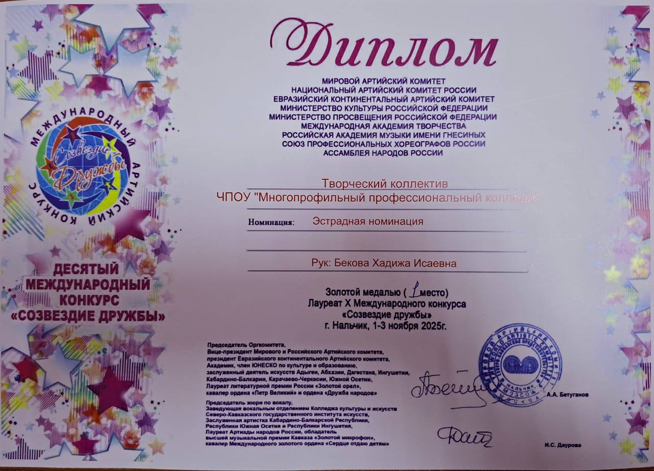 Эта высокая награда вручена за активное участие творческого коллектива нашего колледжа в Х-м Международном конкурсе «СОЗВЕЗДИЕ ДРУЖБЫ».