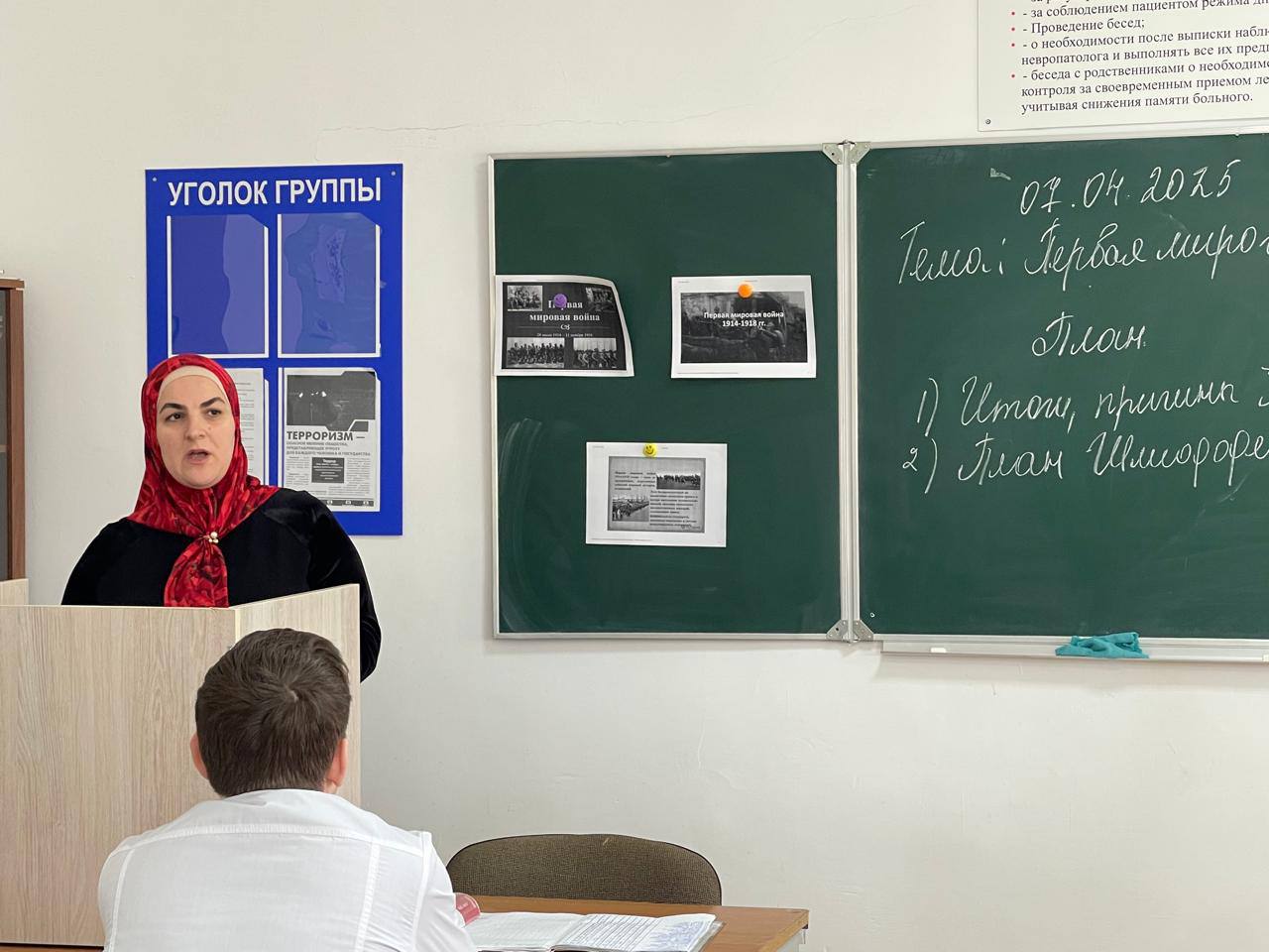 Преподаватель истории Медова Мадина Иссаевна провела открытый урок со студентами СП-9-24 на тему: «Первая мировая война 1914-1918г.»