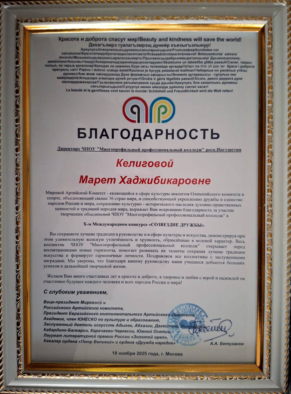 Директор «Многопрофильного профессионального колледжа» Келигова Марета Хаджибикаровна отмечена Благодарностью Мирового Артийского Комитета!