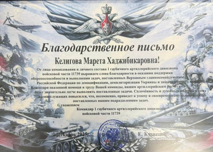 Директор Многопрофильного профессионального колледжа Келигова Марета Хаджибикаровна награждена медалью «За помощь фронту» и благодарственным письмом от командования В/Ч 11739 за оказываемую помощь подразделениям и частям Вооруженных Сил Российской Федерации, выполняющим боевые задачи в зоне проведения специальной военной операции