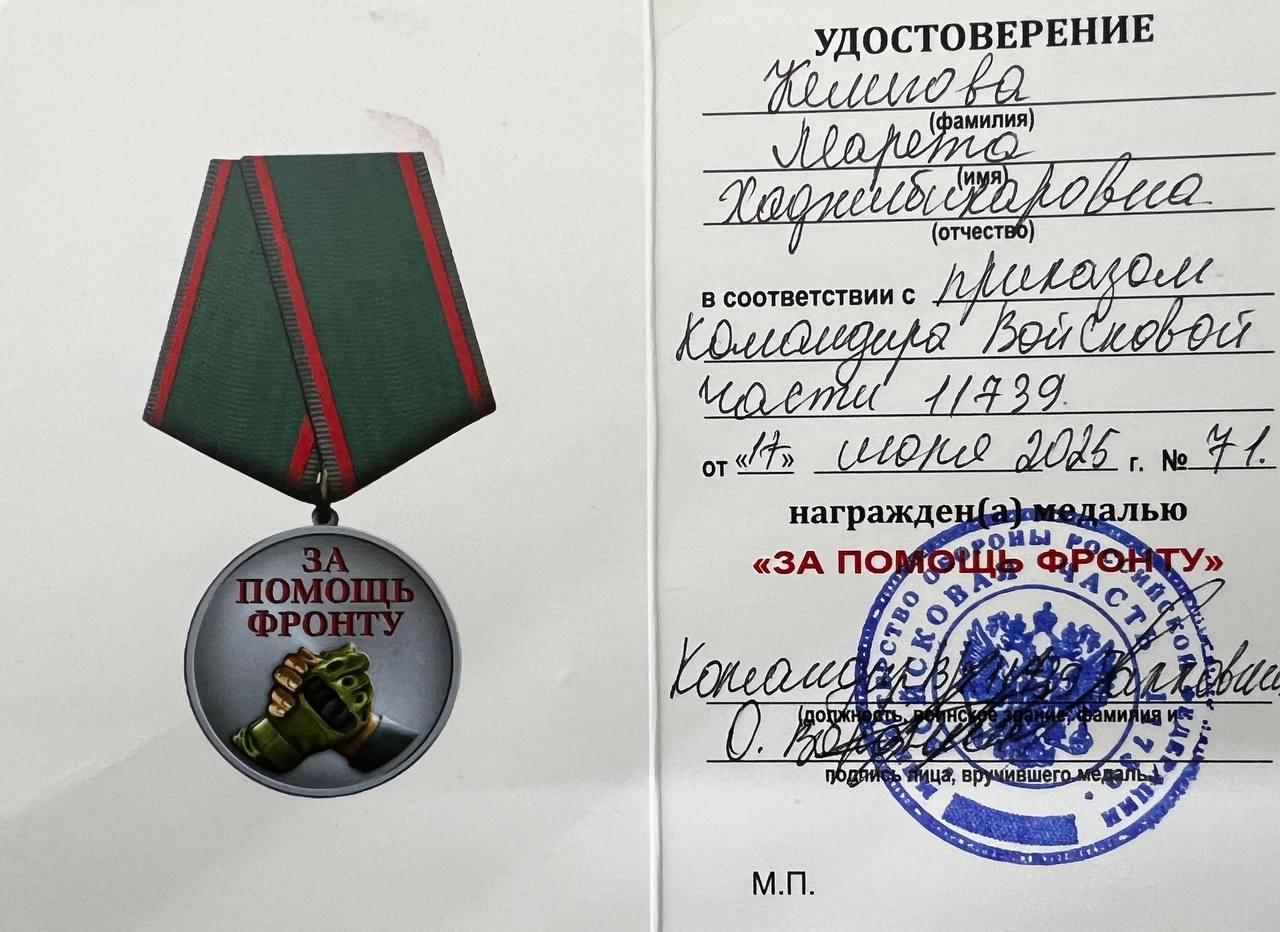Директор Многопрофильного профессионального колледжа Келигова Марета Хаджибикаровна награждена медалью «За помощь фронту» и благодарственным письмом от командования В/Ч 11739 за оказываемую помощь подразделениям и частям Вооруженных Сил Российской Федерации, выполняющим боевые задачи в зоне проведения специальной военной операции