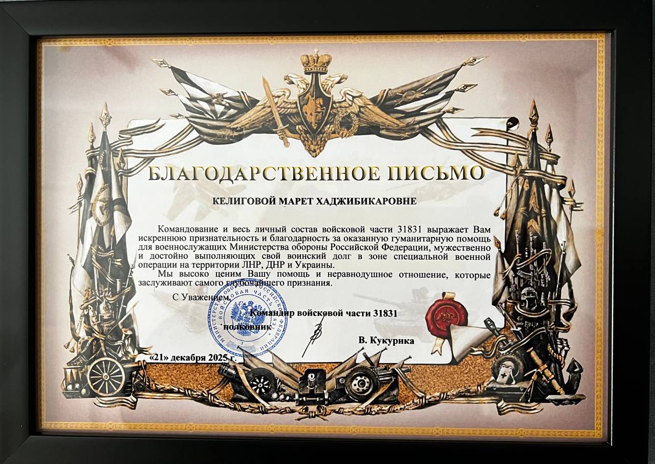 Директор колледжа Келигова Марета Хаджибикаровна получила благодарственное письмо от командования В/Ч 31831 за оказываемую помощь подразделениям и частям Вооруженных Сил Российской Федерации, выполняющим боевые задачи в зоне проведения специальной военной операции