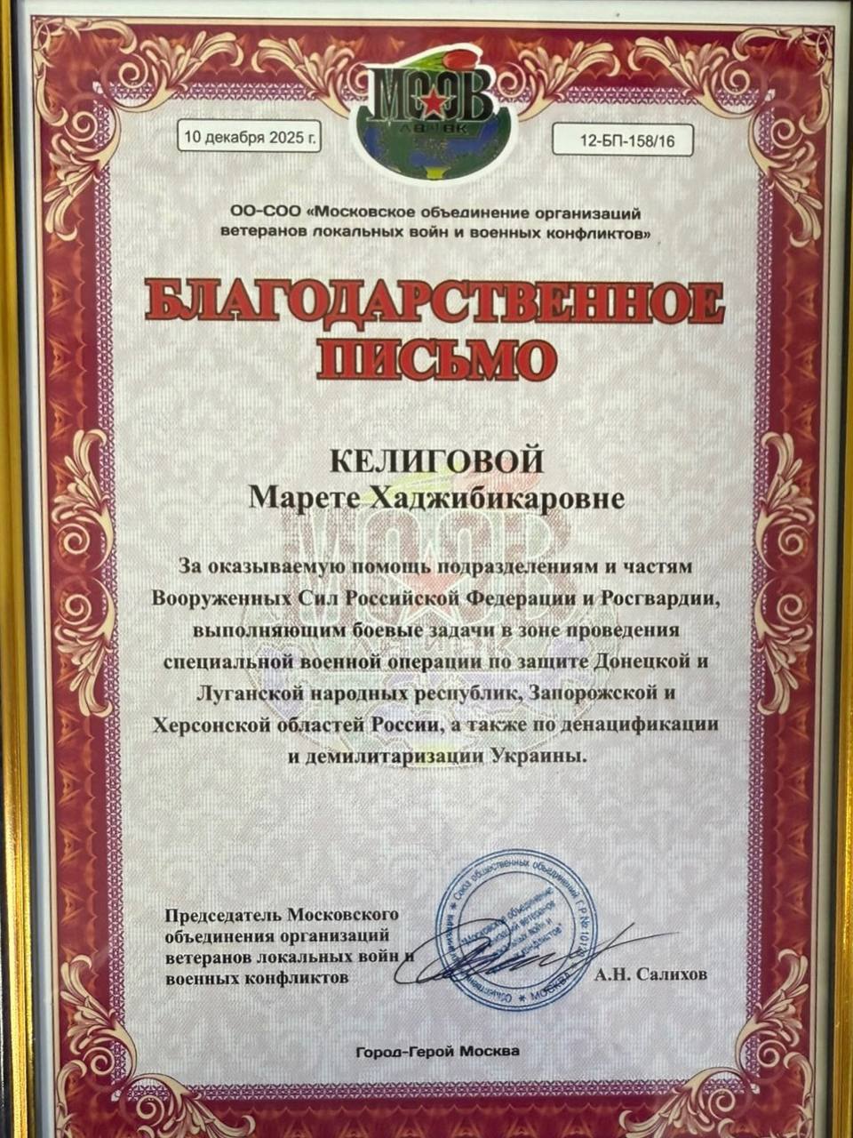 Директор колледжа Келигова Марета Хаджибикаровна получила благодарственное письмо от председателя московского объединения организаций ветеранов локальных воин и военных конфликтов за оказываемую помощь подразделениям и частям Вооруженных Сил Российской Федерации, выполняющим боевые задачи в зоне проведения специальной военной