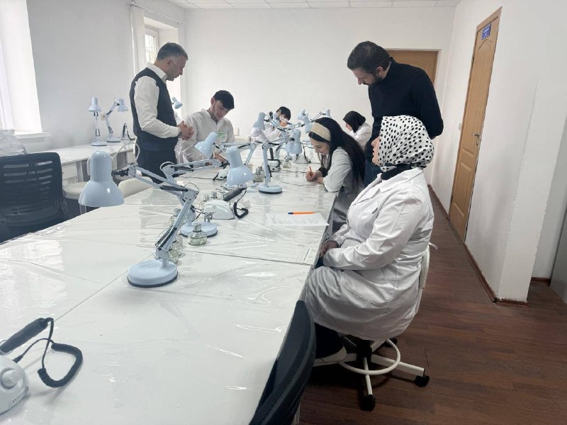 Первый экзамен посвящен технологии изготовления несъемных протезов. Принимают экзамен ведущие преподаватели кафедры стоматология ортопедическая Мурзабеков И.Х. и Дарбазанов Б.Т. Студенты блестяще отвечают на теоретические вопросы и демонстрируют освоенные практические навыки под руководством экзаменационной комиссии.
